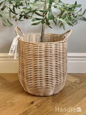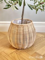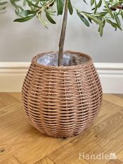 - 丸い形が可愛いフェイクラタンの鉢カバー、ナチュラル色のおしゃれなプランターバスケット (n22-291)