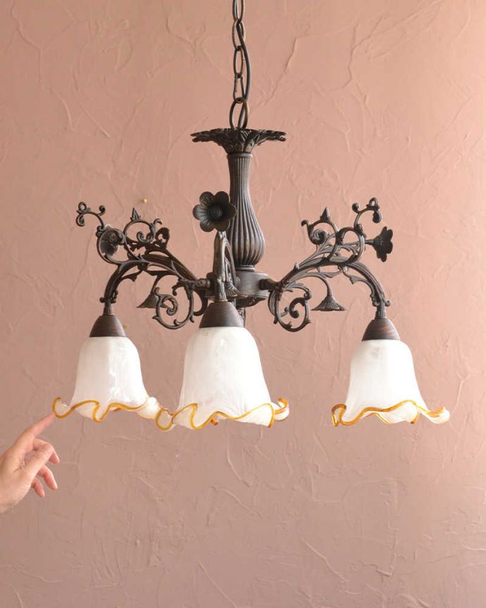 下向きの3灯タイプなので、日本の方も使いやすいタイプのシャンデリアです。ガラスのシェードももれなく一緒に付けてお送りします。