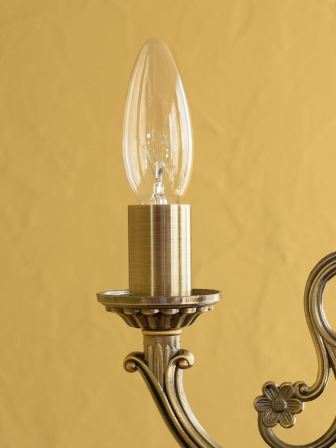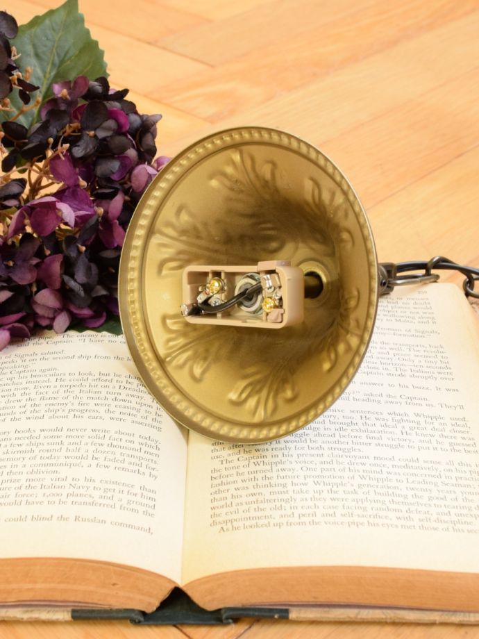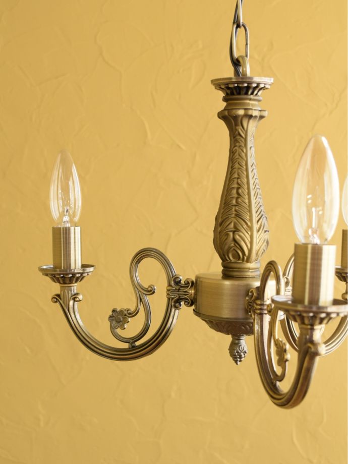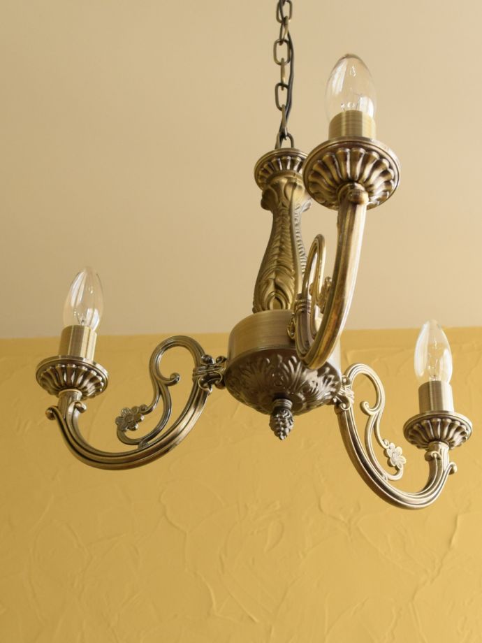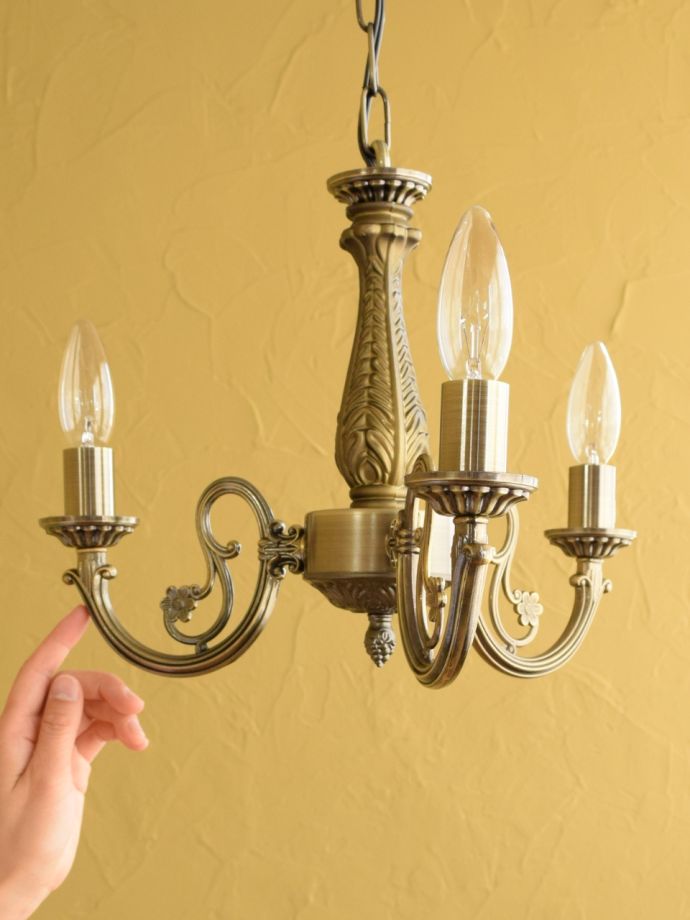キュッと小さくまとめたコンパクトサイズのシャンデリアなんだけれど、まるで時を経た真鍮製の照明らしく重厚感があって堂々とした雰囲気。