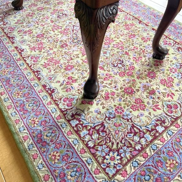 グリーン色のめずらしいカーペット、お花が描かれたケルマンのペルシャ絨毯 (m-9922-z)