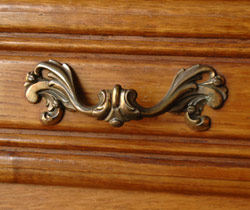 - ツートーンカラーの取っ手がおしゃれなアンティークチェスト、イギリスから届いたオールドパインの表情が美しい3段チェスト (h-133-f)