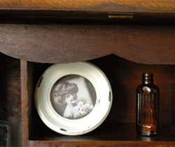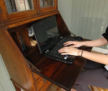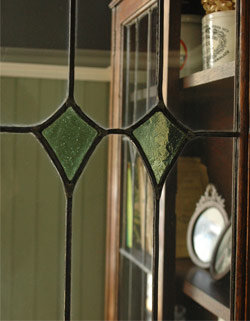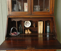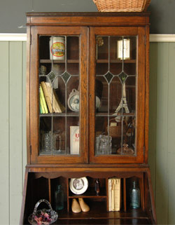 パソコンや手紙を書くためのデスクって味気ないものが多いのですが、こんなにガラスのキレイなキャビネットが付いているものだったら、最高です!
