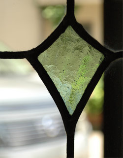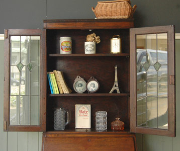 - ステンドグラス扉が美しいアンティークの収納付き机、イギリスから届いたビューローブックケース (k-3053-f)