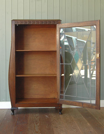 - アールデコスタイルのおしゃれなアンティーク飾り棚、ステンドグラス扉がカッコいいショーケース (k-3431-f)