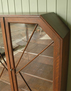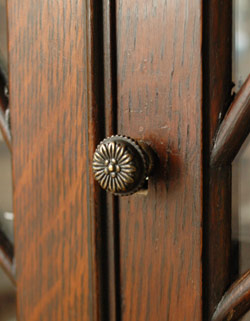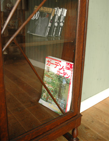 美しくまとまりのあるアンティークブックケース。ガラスに施された木の装飾がかっこいい雰囲気です。