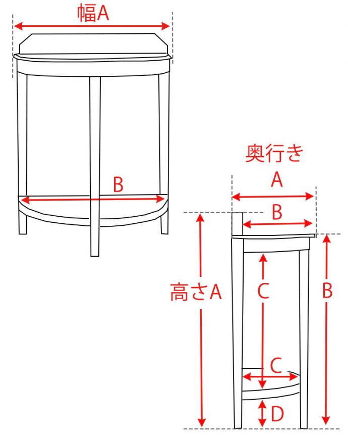 【 奥行き 】A:37 B:33 C:25cm 【 高さ 】A:84 B:76 C:54 D:12cm |