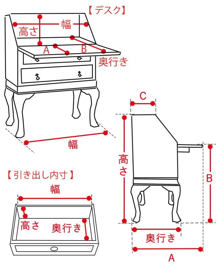 A:77cm B:73cm C:23cm 【 デスク 】 幅89×奥行きA:32 B:55×高さ24cm 【 引き出し 】 (1段目)幅82×奥行き36×高さ10cm (2段目)幅82×奥行き36×高さ11cm 【デスク内引き出し】 幅20×奥行き15×高さ5cm×2 |
