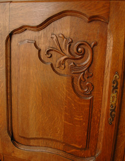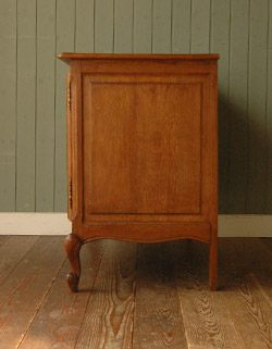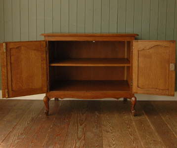 フランスのアンティークらしい、ゴージャスな彫がたっぷりのキャビネット。迫力ある美しさにうっとりと楽しめるのですが、扉を開くと、中には便利な収納がたっぷりなので、リビングの電話台や個室の小さなテレビ台としておススメです。