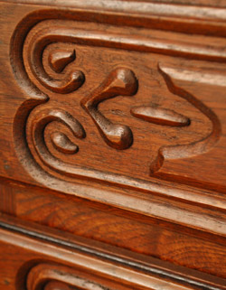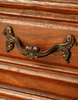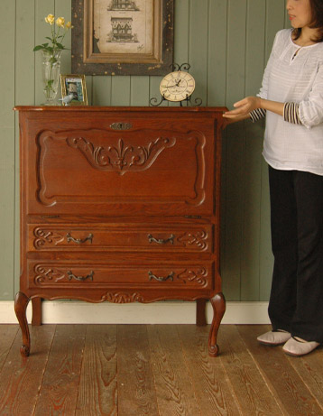 上品で美しいデザインが目を引くフランスのキャビネット。華のある彫をうっとりと眺めながら、扉を開けば、中は収納スペースになっています。