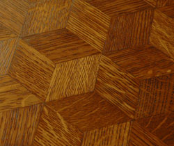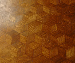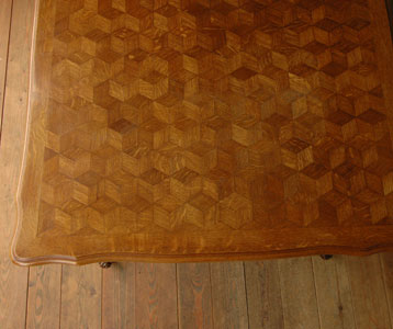 無垢材を使った寄木加工の天板なので、模様が「ホンモノ」です。