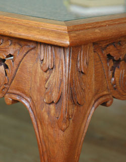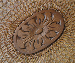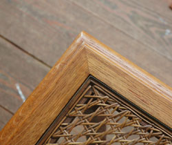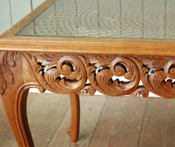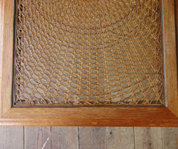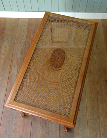 天板にアンティークのガラスがはめ込んであります。おかげで、キレイに編まれた模様も切れているところがほとんどなく、美しい状態で残っていました!