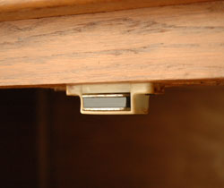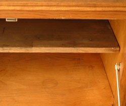 扉を前に倒して開くと、中には棚板に仕切られた収納スペースがあります。