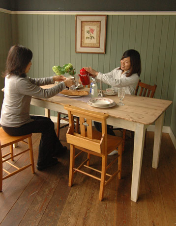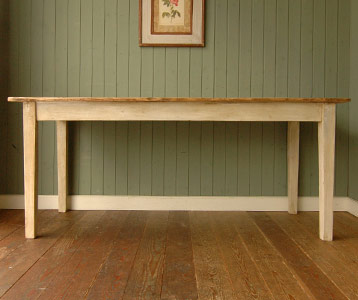 広々と使えるゆったりサイズのダイニングテーブルが入荷してきました。天板がカスタード色になっている人気の2トーンタイプ。 アンティークの風合い、たっぷりで、とってもいい感じです。
