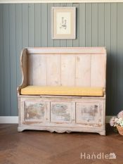 - シャビーシックな白いアンティークのホールベンチ、イギリスから届いた収納付きチャペルベンチ (h-033-c)