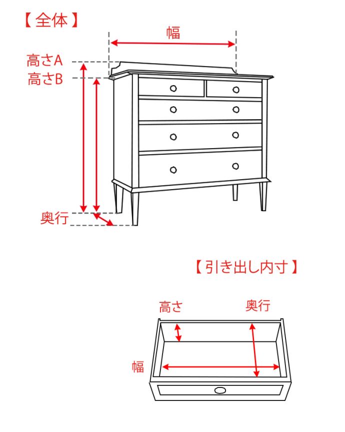【 全体 】幅53×奥行き37×高さA:98cm B:108cm 【 天板 】幅53×奥行き37cm 【 引き出し 】 幅39×奥行き29×高さ8cm×5 |
