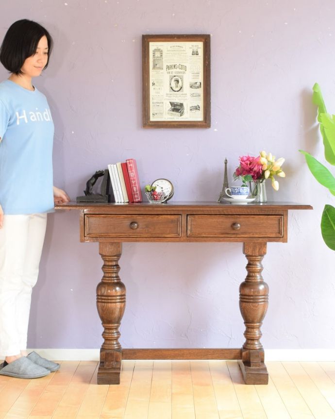 壁にピタッとくっつけられるコンソールは人気モノなんですが、ハーフムーン型が多いので、この子みたいなオーク材で、スクエア型、さらに引き出しも付いているコンソールは、めったに見かけることがないから、個性派の方にオススメ!