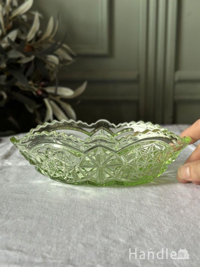 アンティークガラスの美しい食器、グリーン色のプレスドグラスのガラスボウル (商品番号 k-5599-z)