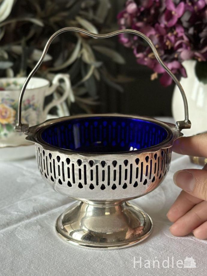 透かし彫りがとってもキレイなシルバープレートの中に、深いブルー色の美しいガラスボウルがセットされたアンティークのシュガーボウルを見つけてきました。