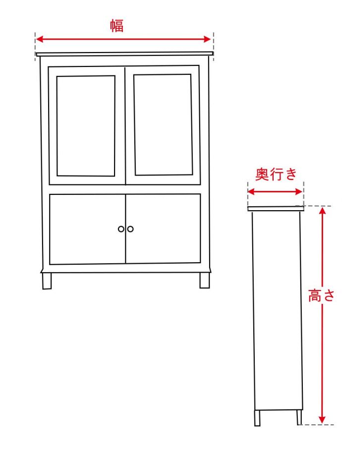 【 上ガラス扉内寸 】 (棚板)取り外し可能 幅66×奥行23cm (1段目)高さ31cm (2段目)高さ25cm (3段目)高さ28cm (4段目)高さ26cm×奥行25cm 【 下棚内寸 】 (棚板)固定 幅77×奥行26cm (1段目)高さ19cm (2段目)高さ17cm×奥行42cm |