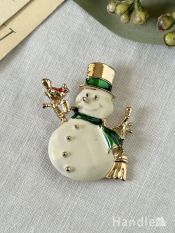 - 幸せを運ぶグリーン色のマフラーを巻いたスノーマン、イギリスから届いたビンテージのおしゃれなブローチ (m-9595-z)