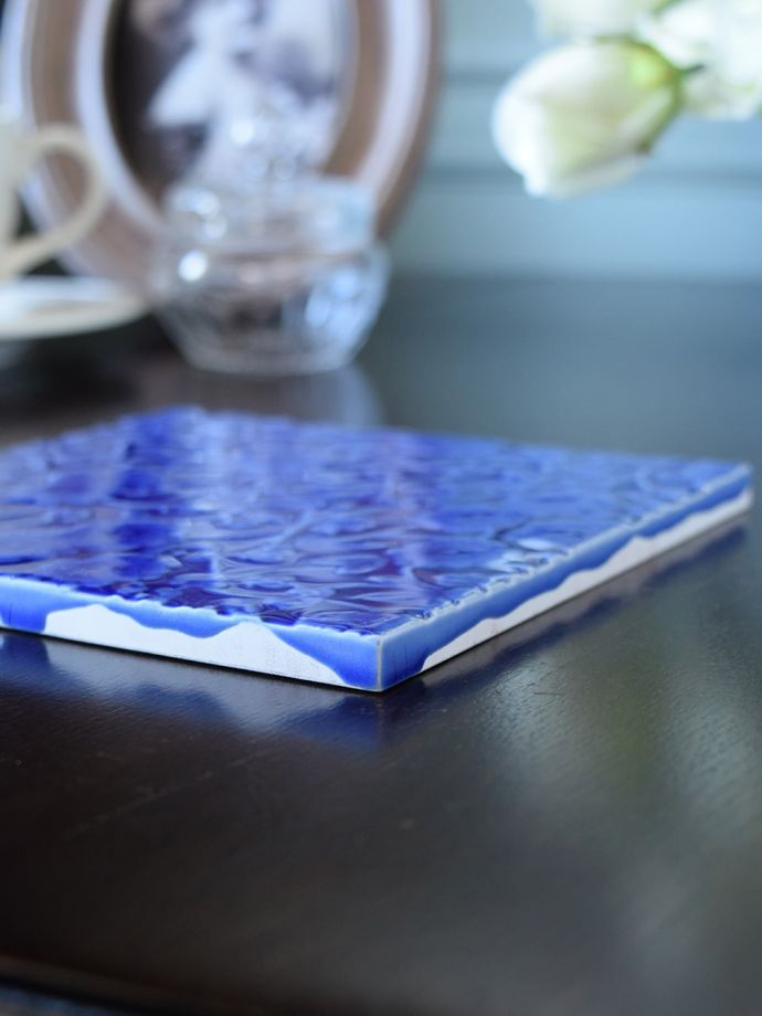 光沢のある釉薬で覆ったハンドメイドのタイルは、壁に貼るのはもちろん、コースターやトリベットのようなインテリア雑貨としてもおススメです。