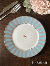 爽やかなブルー色で縁取りされたおしゃれなプレート、小鳥が描かれた可愛いケーキ皿 (商品番号 n18-574)