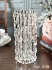 - イギリスから届いたアンティークガラスの花びん、ダイヤ型の型押し模様が可愛いプレスドグラスのフラワーベース (pg-8185)