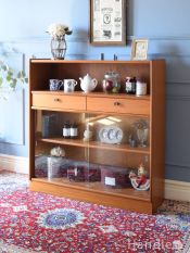 - シンプルなデザインがおしゃれなビンテージキャビネット、Parker Knoll社の引き戸タイプのガラスキャビネット (x-1760-f)