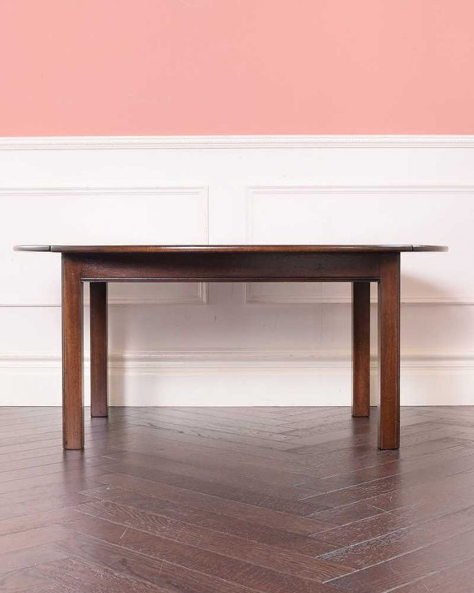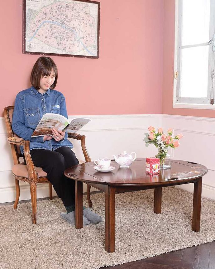 しかも折り畳んだ時、横から見た姿も可愛いんです。広げた状態で、上から見ると、丸いちゃぶ台!(笑)見どころたっぷりのコーヒーテーブルの変身する姿を楽しんで下さい(笑)※アンティークは1点ものです。他の方がカートに入れてSOLD OUTになった時点で同じものはご準備できませんので、ご了承下さい。