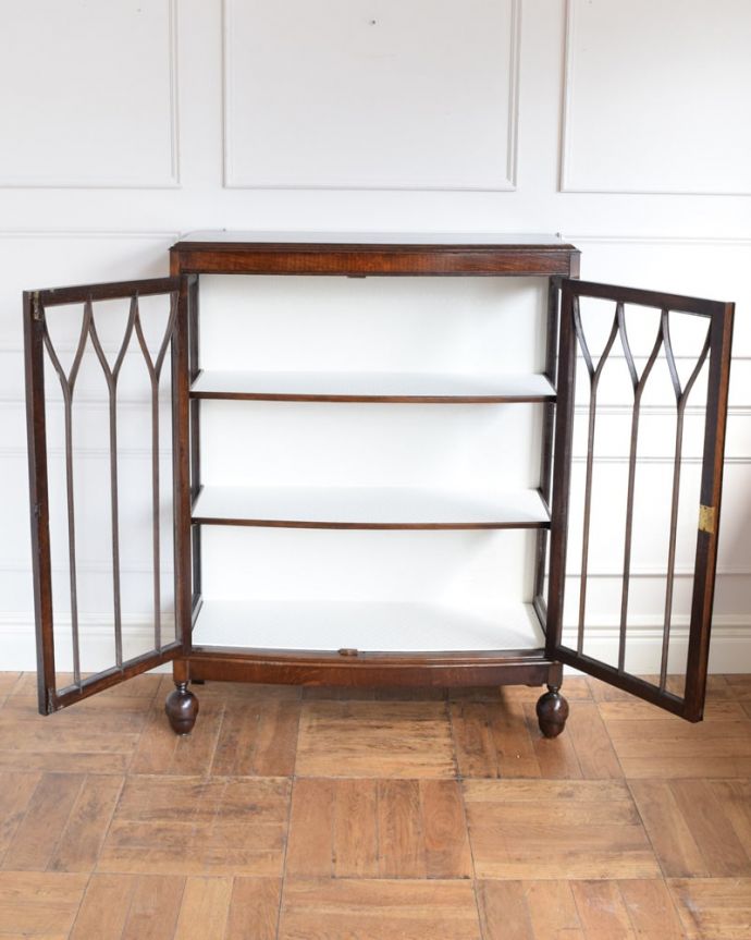 アンティーク家具の中でも定番のデザイン、ずっと使い続けられているゴシックデザインの中でも人気のポインテッドアーチのガラスキャビネットが到着です。