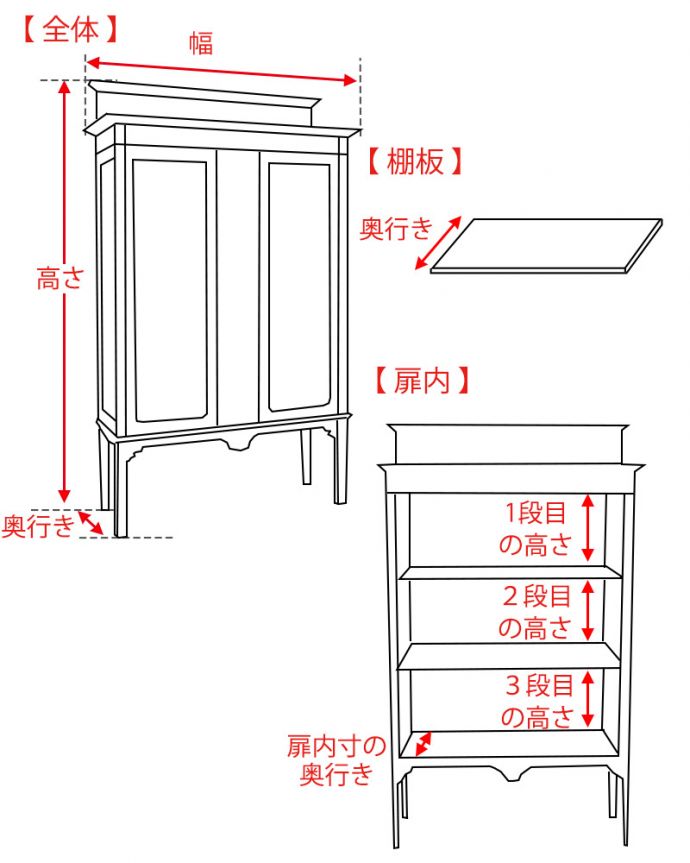 アンティークキャビネット扉の中 - 専門の職人がしっかり修復したので安心してお使いいただけます。いろんなものをたっぷり収納して楽しんで下さい。
