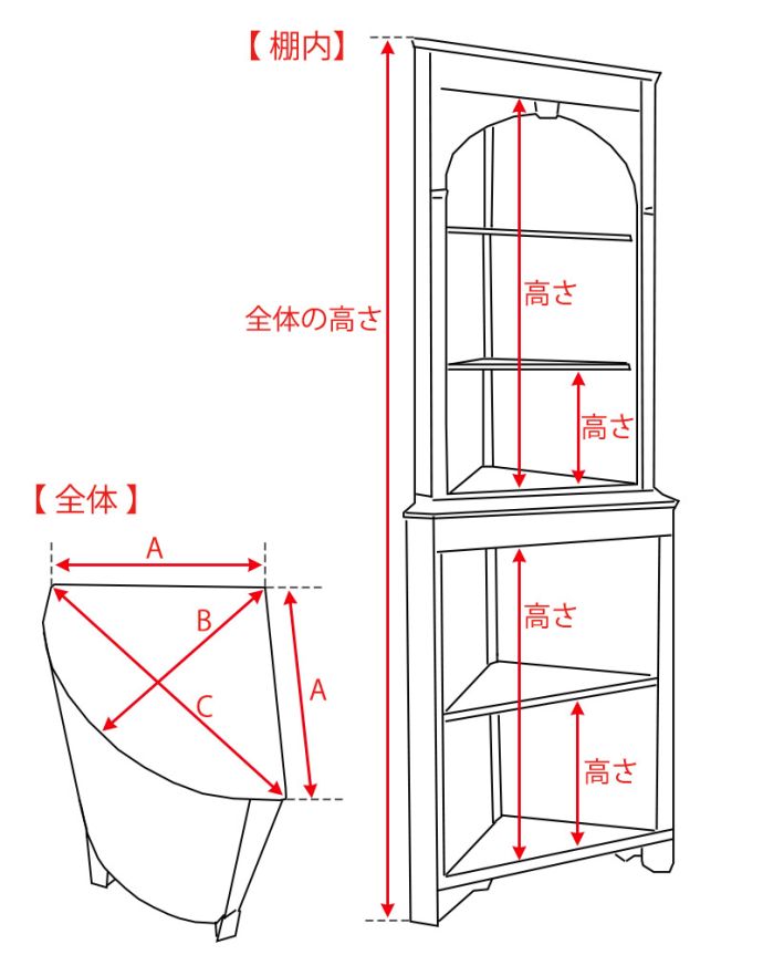 【 扉内 】A:23 B:37.5 C:32 高さ:50cm 【 下段内 】A:41.5 B:38 C:59 高さ:29㎝ 【 左右小棚内 】高さ(1段目)29cm (2段目)19cm |