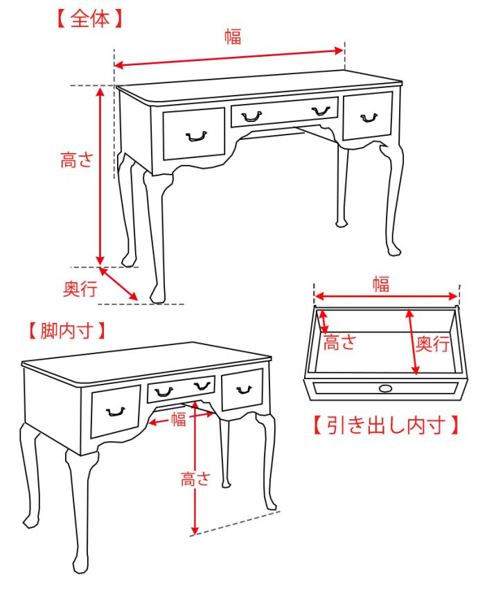 【 脚内寸 】 幅90×高さ59cm 【 引き出し 】幅40×奥行き36×高さ6cm×2 |