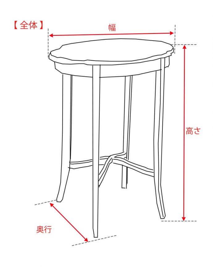 オケージョナルテーブルの側面 - アンティークなので経年変化によるキズはありますが、専門の職人が修復した家具は360度キレイです。