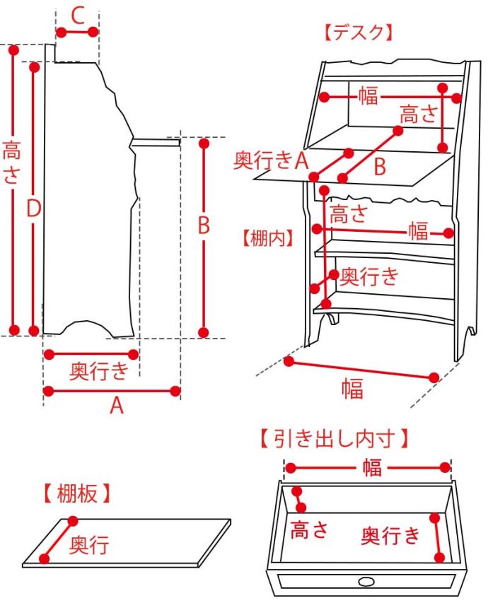 A:61cm B:80cm C:9cm D:108cm 【 デスク 】 幅63×奥行きA:31 B:61×高さ26cm 【 引き出し 】 幅61×奥行き25×高さ8cm 【 棚内 】 幅63×奥行き27×高さ54cm 【 棚板 】取り外し可能 奥行き25cm 高さ(1段目)28cm (2段目)26cm |
