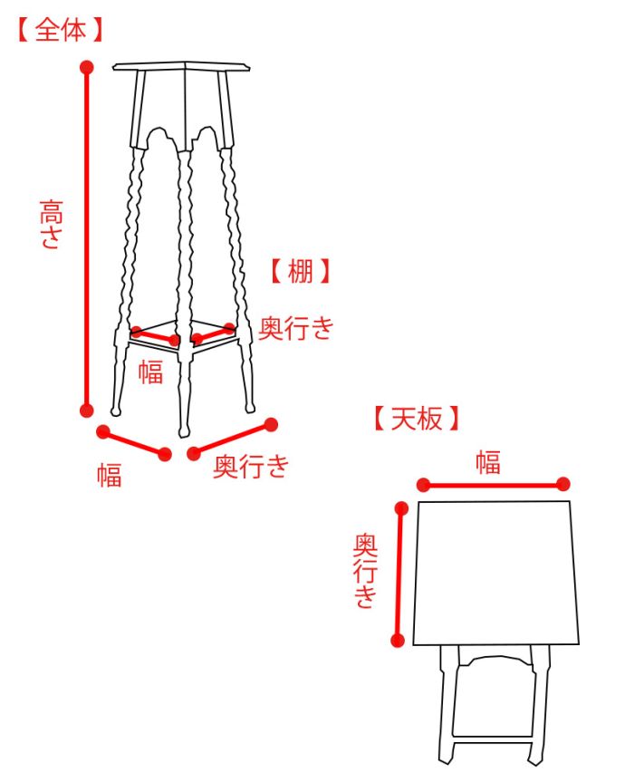 【 天板 】幅33×奥行き33cm 【 棚 】 1段目:幅28×奥行き28×高さ39cm 2段目:幅28×奥行き28×高さ35cm |