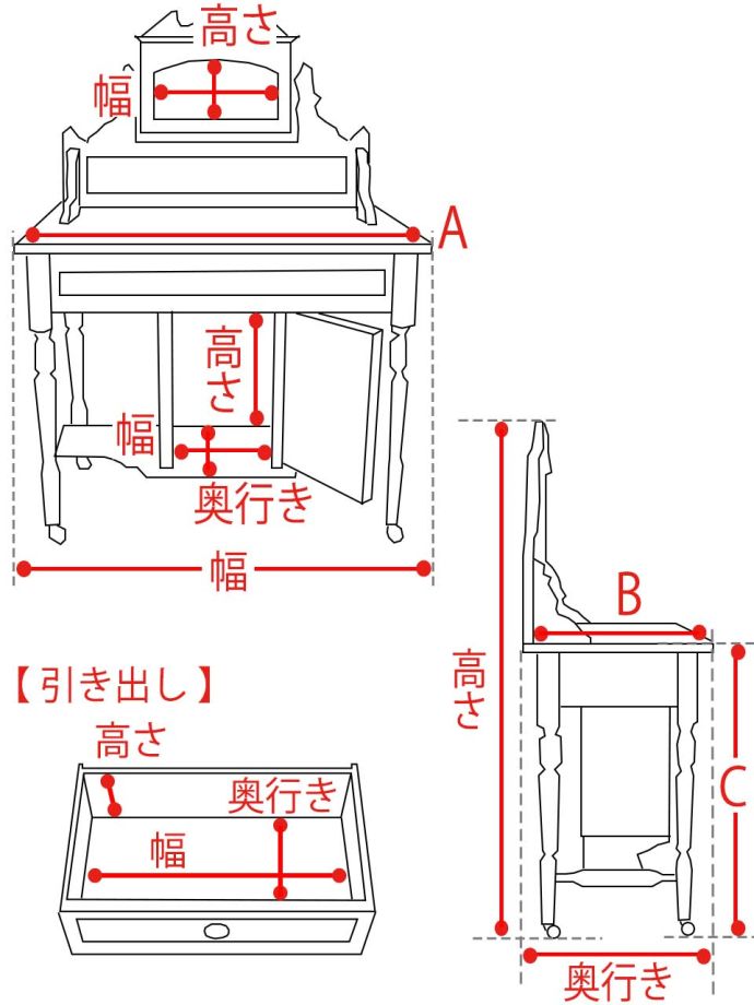 【 ミラー 】横35×縦24cm 【 引き出し内寸 】幅42×奥行き28×高さ7cm×2 【 扉内寸 】幅30×奥行き22×高さ38㎝ |
