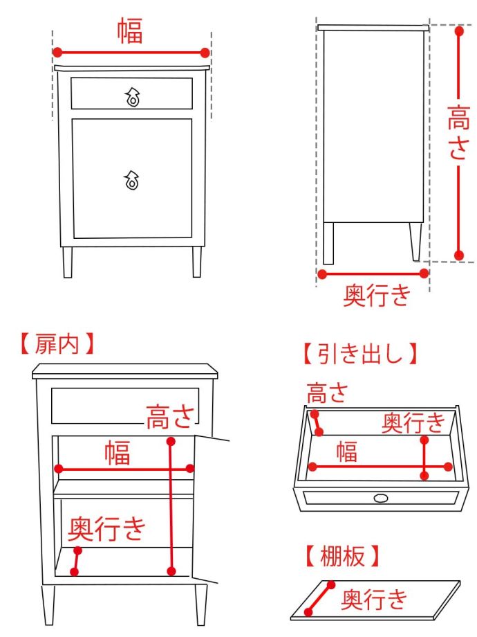【 天板までの高さ 】73cm 【 扉内 】幅39×奥行き24×高さ48cm 【 棚板 】高さ調整可能 奥行き22cm 【 引き出し 】幅36×奥行き20×高さ8.5cm |