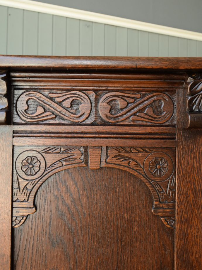 - イギリスアンティークの重厚なキャビネット、美しい装飾が入ったオーク材のビンテージサイドボード (h-181-f)