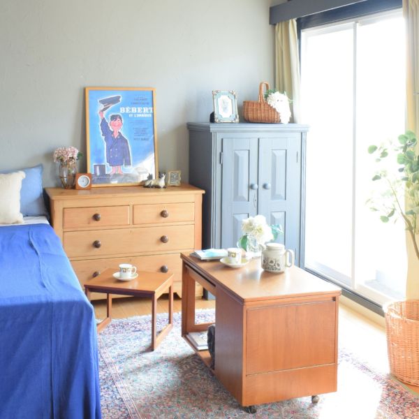 ペイントの家具と畳をベントウッドでまとめた寝室コーデ
