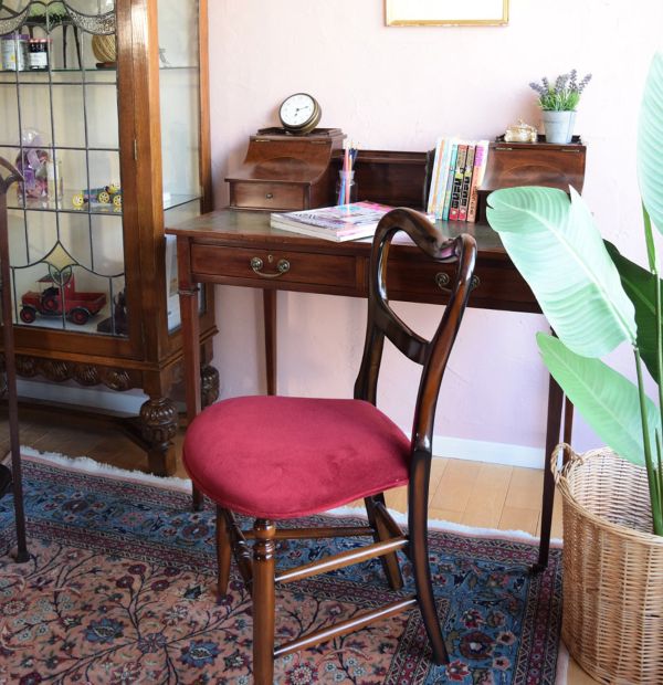 今日のテーマは・・・ピンク!お部屋の壁とソファの色をピンクにして、赤い座面の椅子を足して、ヘレケの絨毯をパッと広げたら・・・完璧☆ ビックリするくらい、みんなで完璧なハーモニーを奏でている感じのリビングになって、私のテンションも上がりまくり~! ここに、ガラスキャビネットとシャンデリア、そしてレディデスクをプラスして、このまま離れたくないって思っちゃうお部屋が完成しました。今日の主役は、やっぱりヘレケ。縁取りのブルーが効いてます☆
