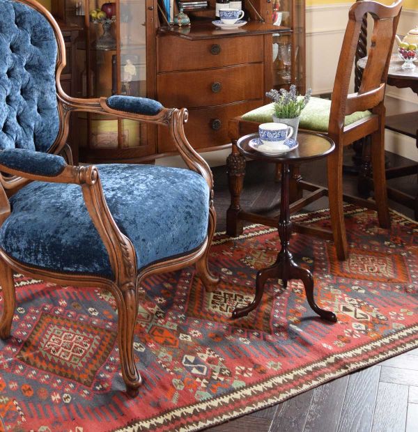 昨日の夜、カーリングを見ていて寝不足の私(笑)ついウトウトしそうになって、お昼寝するナーシングチェアのある書斎をコーディネートしてみました。 大きな大きな座面の一人掛けソファの色をブルーで選んだので、同じ青が少し入った真逆の赤色ベースのオールドキリムを選んで、壁面には少し赤っぽい茶色のサイドバイサイドを。 サイドバイサイドに腰掛けて仕事しようと思うんだけれど、どうにもこうにも眠い~(苦笑)ちょっとお昼寝してから頑張ろうかな?・・・