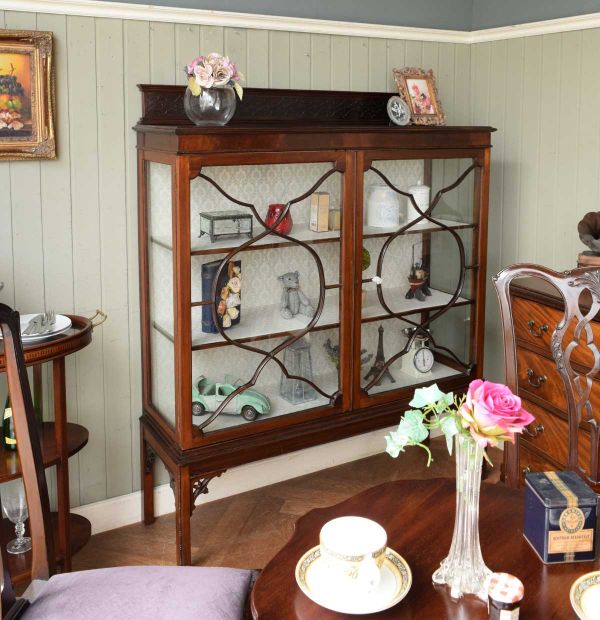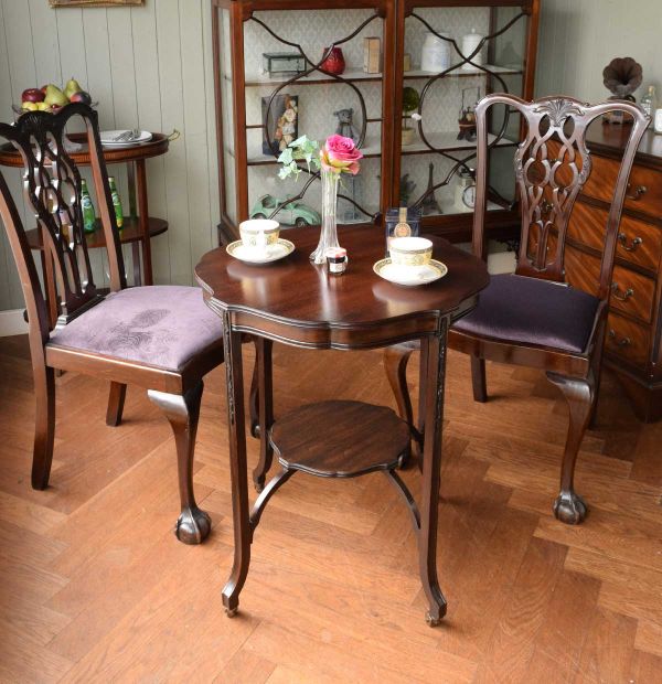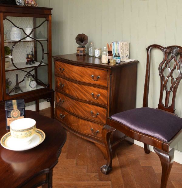 久しぶりに同じスタイルの家具を集めて、トータルコーディネートがしたくなって、英国クラシックスタイルのリビングをコーディネートしてみました。 オケージョナルテーブルを置いて、クロウ&ボールが印象的なチッペンデールチェア2脚で囲んだティースペース。チェストを置いた隣に、小さなレディデスクを置いて、書斎コーナーを作ってみました。 ガラスキャビネットの隣に、象嵌が美しいトレイ付きのテーブルを置いて、ここでお茶を入れてテーブルまで運ぶ時間・・・憧れる~(笑)