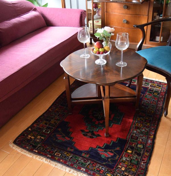 今日も朝から大忙し!お花のお稽古に行って、その後、久しぶりにお世話になっている人たちとランチ勉強会。なんだか疲れたな・・・と思いながら、夜、ゆったり過ごすリビングをコーディネートしてみました。 トライバルラグの色に合わせて、ピンク色のソファと水色の座面のサロンチェアを置いたリビング。中心には、ものすごく木目が美しいネストテーブルを置いていい感じ~! キラッと輝くミラーが付いた猫脚のミュージックキャビネットを置いて完成。ピンク色のシェードとマリーの色がピンク色のコントラストが春を感じさせてくれます。