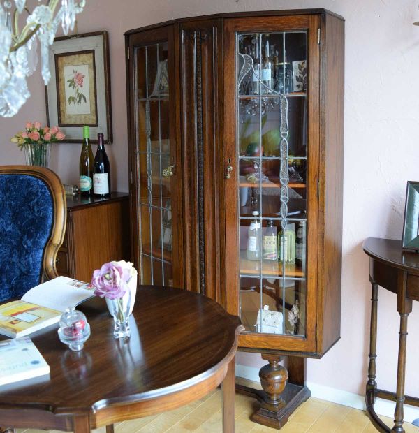 優しい色をちょっと引き締めたいので、チョコレート色のカップボードを中心に置いてみました。