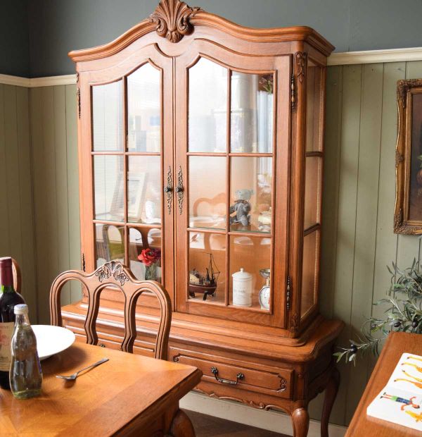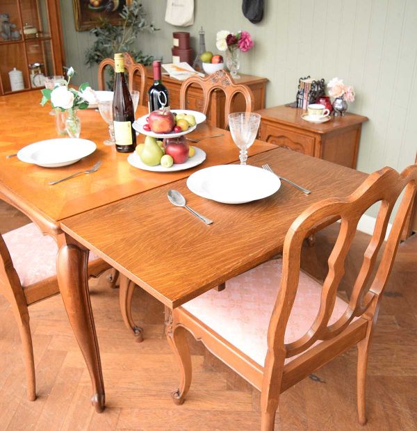 実は、次の便でほとんど見つけることが出来なかった、猫脚の伸長式テーブルを見ていたら、久しぶりにトータルコーディネートしたくなって、フレンチスタイルのダイニングをスタイリングしてみました。 たくさん連れて帰って来たと思っていても、気が付けばお嫁に行ってしまっているドローリーフテーブルに、お揃いの椅子をセッティング。 同じくガラスキャビネットとチェストを置いて、壁かけのフックボードを取る付けた、完璧フォーマルなスタイルで食べる食事。何を食べてもフレンチ気分デス(笑)