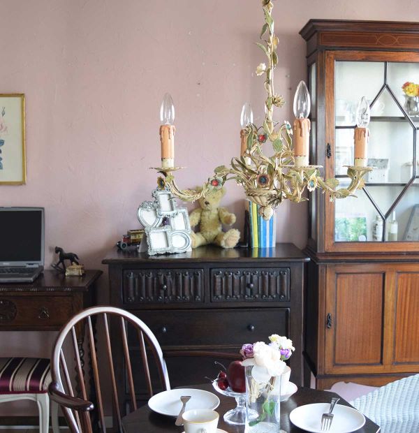 すっごく春らしいお天気になってきたので、この時期にピッタリだなと思って選んだお花のモチーフのシャンデリアからコーディネートを始めてみました。 このシャンデリアに似合う椅子は、やっぱりロイドルーム!白いロイドをセレクトして、ナチュラルな雰囲気にしようかとも思ったんだけれど、あえて周りをチョコレート色の家具で囲んでみました。 おかげでシャンデリアとロイドルームがすごく目立つお部屋が完成。挿し色効果もあって、濃い色の家具ばかりを集めても暗くなりすぎないお部屋が出来上がるのでおススメです!