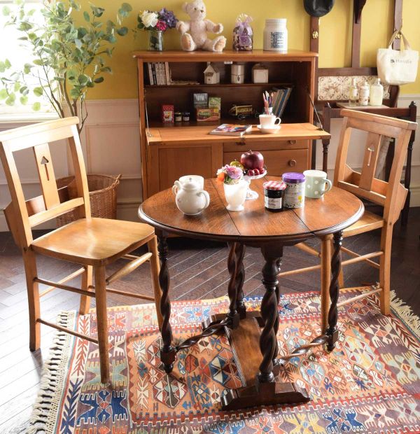 今日は私の基本に戻って、チャペルチェアを2脚使って、お茶するコーナーを作ってみました。 クロスの抜きが入ったチャーチチェアを見る度に、初めてアンティークを見た時の感動を思い出して、初心に戻れる感じがするから好き! あの時の感動を、もっとたくさんの人に伝えたいな・・・と思いながら、ゲートレッグテーブルと組み合わせたティーコーナーで、アーコールのキャビネットと一緒にお茶を楽しんでいます。