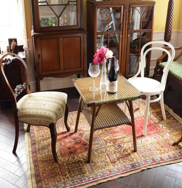 今日は朝からものすごい風!吹き飛ばされそうな風の音にビックリしながら朝、早くに目が覚めたので、ちょっと濃いめのお茶を飲んで新聞を読む部屋を作ってみました。 美しいセティに座って新聞を読むと、なんだか賢くなった気分(笑)まだ少し暗いお部屋の中で、明るめのトライバルラグを敷いてゴールド色のロイドルームのテーブルをベントウッドとバルーンバックで囲んでみました。 床が華やかだとお部屋も明るくなる~!さぁ、今日も一日頑張ったので、夜はここで久しぶりにワインでも飲もうかな??(笑)