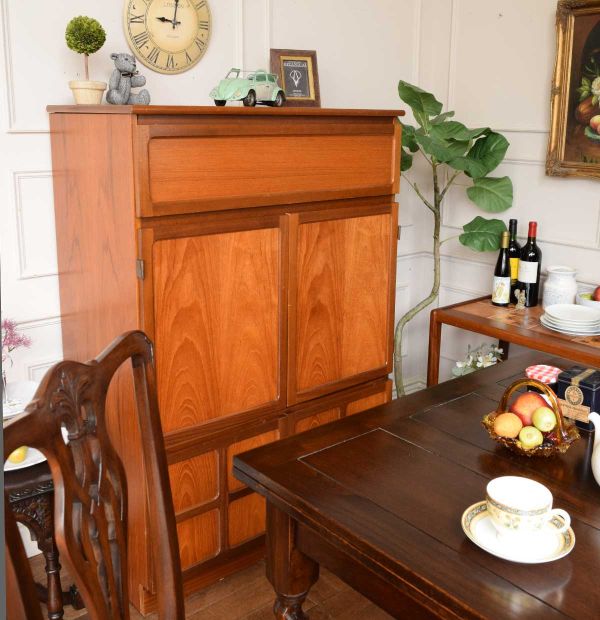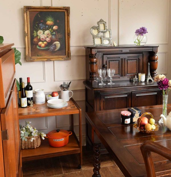 大きなワードローブを食器棚に使う、英国スタイルのダイニング